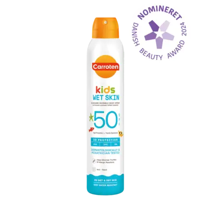 Carroten Kids Wet Spray SPF 50 er en innovation af solbeskyttelse til børn. Carroten fokuserer på børns taktile behov og ikke mindst tålmodighed, når Carrotens SPF på spray nemt påføres våd eller tør hud uden at klistre eller fedte.
