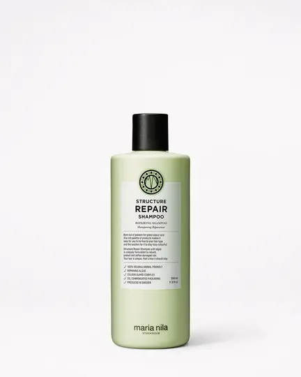 Maria Nila Structure Repair Shampoo er en shampoo, der er specielt udviklet til et skadet, tørt eller kemisk behandlet hår. Den giver fugt, samt virker genopbyggende og styrkende på hårets struktur. Den indeholder blandt andet algeekstrakt, som virker reparerende, og hjælper håret med at få sin naturlige styrke, blødhed og glans. Foruden indholdet af algeekstrakt, indeholder den også Colour Guard Complex, der reducerer farvetab, som opstår ved hårvask og varmestyling. Den beskytter samtidig mod UV-stråler og frie radikaler. Få et velplejet, blødt og glansfuldt hår med Maria Nila Structure Repair Shampoo.